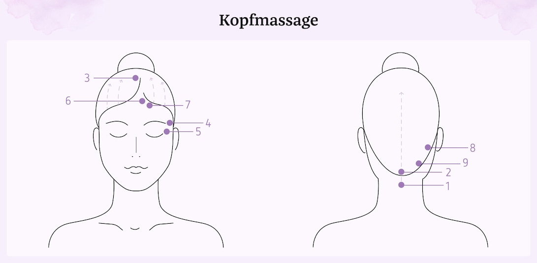 - Streiche zum Abschluss mit flachen Händen vom Haaransatz nach hinten über den Kopf und massiere mit kreisenden Bewegungen von den Ohren bis zum Haaransatz im Nacken (Punkt 8 und 9).