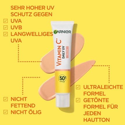 "Ich bin total begeistert vom Vitamin C Daily UV Glow Fluid von Garnier, weil es 3 ausgezeichnete Eigenschaften in einem Allrounder vereint: Das Fluid ist angenehm leicht und verschmilzt schnell mit der Haut, sodass kleinere Hautunebenheiten in wenigen Sekunden kaschiert werden. Außerdem pflegt es die Haut mit Vitamin C und schützt vor UV-Strahlen sowie daraus resultierender Hautalterung dank Lichtschutzfaktor 50.