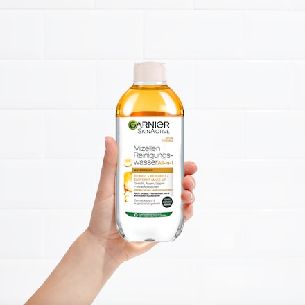 Das Mizellen Reinigungswasser All-in-1 Waterproof befreit Gesicht, Lippen und Augen schnell und schonend von Make-up-Resten und Schmutzpartikeln. Dank innovativer Mizellen-Technologie ganz ohne Reiben und ohne zu strapazieren.