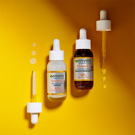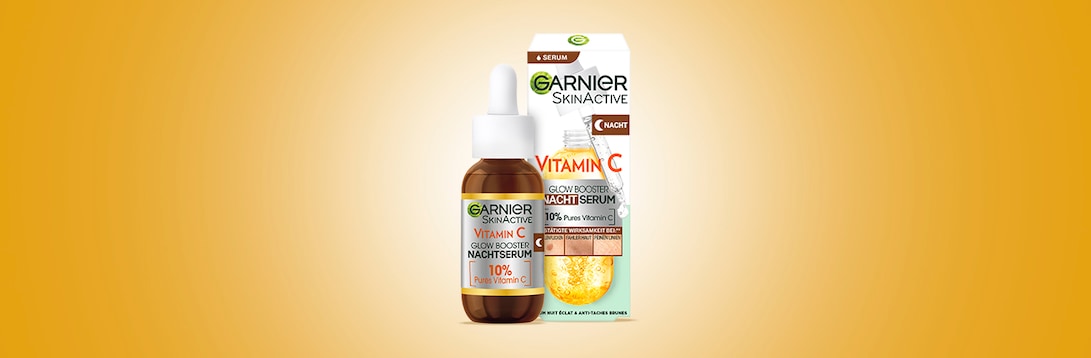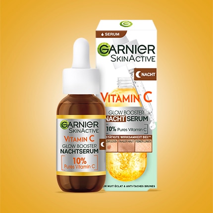 Das Vitamin C Glow Booster Nachtserum aus der Linie Seren & Öl von GARNIER hilft der Haut während der nächtlichen Ruhephase bei ihrer Regeneration Seine Rezeptur kombiniert 10 % reines Vitamin C mit Hyaluronsäure. Bereits nach der ersten Nacht schenkt es der Haut ein glatteres und erholtes Erscheinungsbild. Nach drei Nächten ist die Haut dank Vitamin C aufgehellt. Feine Linien, Unebenheiten und dunkle Flecken sind nach zwei Monaten sichtbar reduziert. Hyaluronsäure füllt die Feuchtigkeitsdepots der Haut auf und schützt sie vor dem Austrocknen.