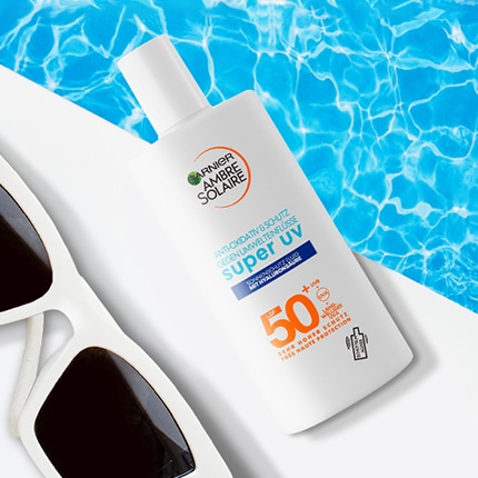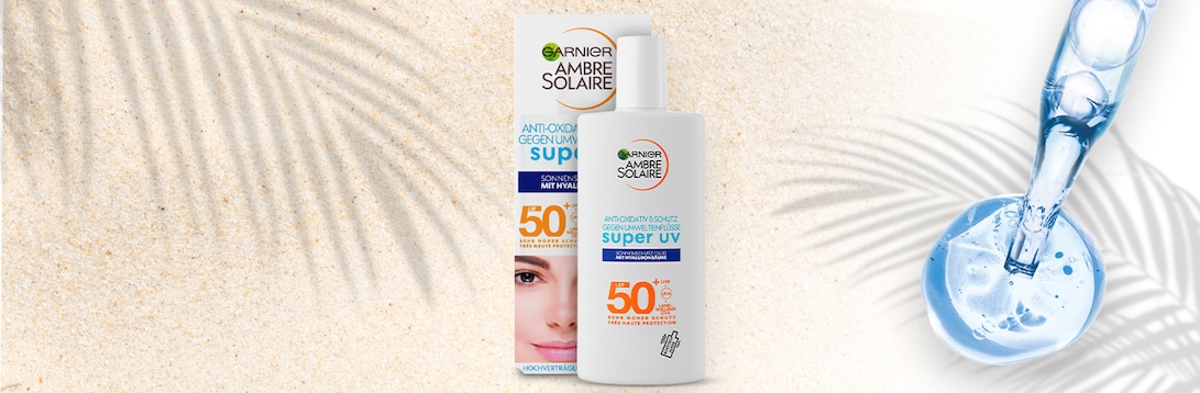 Das Garnier Ambre Solaire Anti-Oxidativ Super UV Sonnenschutz-Fluid LSF 50+ mit Hyaluronsäure beugt sowohl effektiv Sonnenbrand als auch sonnenbedingten Pigmentpflegen im Gesicht vor.