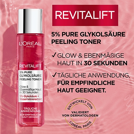 Der Glykolsäure Peeling Toner aus der Serie Revitalift von L'Oréal Paris bietet intensive Hautpflege samt natürlichem Peeling innerhalb von nur 30 Sekunden. Der Toner sollte als erster Schritt in der Hautpflegeroutine erfolgen und kann auch bei empfindlicher und sensibler Haut verwendet werden. Der Revitalift Glykolsäure Peeling Toner von L'Oréal Paris enthält 5 Prozent pure Glykolsäure und ist für die tägliche Anwendung geeignet. Er ist mit Wassermelonenextrakten und Aloe vera angereichert und versorgt dadurch Ihre Haut bei jeder Anwendung mit reichhaltiger Feuchtigkeit. Durch die Glykolsäure erfolgt ein sanftes Peeling, durch das abgestorbene Hautzellen während der Hautpflege schonend entfernt werden. Dadurch trägt der Toner zu einem ebenmäßigen und strahlenden Hautbild bei.