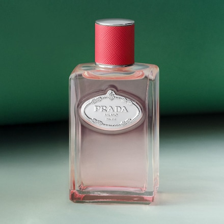 Die rosa getönte Farbe des Duftes erscheint in einer luxuriösen Flasche mit einem ikonischen Saffiano-Lederverschluss in einem leuchtenden Rosa: ein verspielter Hinweis auf die Hauptzutat.